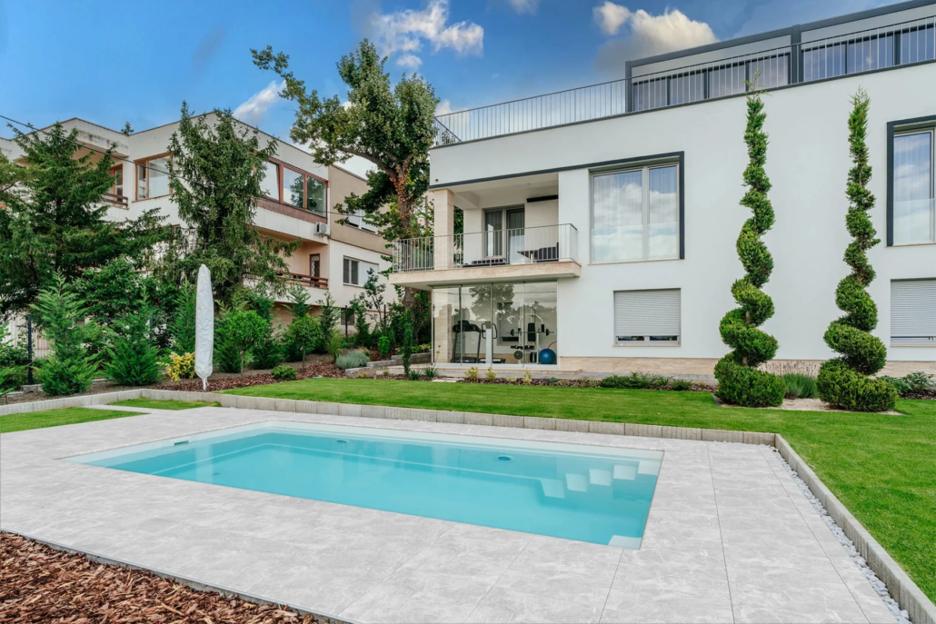 Olympia är en medelstor glasfiberpool som är tillverkad i ett stycke med två integrerade trapppr. Trapporna är placerade i varsitt hörn på kortsidan vilket innebär att poolens fulla längd kan nyttjas. Olympia är uppbyggda med flera skikt och tillverkas med keramisk kärna som är en central del av väggstrukturen, vilket gör stommen extra stabil och hållbar.